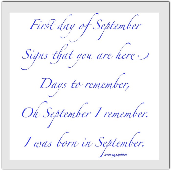 SEPTEMBER sistermags / 1 September 2017 First day of September Signs that you are here. Days to remember, Oh September I remember. I was born in September. img_3531 9.791999 125.439111 share Email a link to a friend (Opens in new window) Email Share on Facebook (Opens in new window) Facebook Share on WhatsApp (Opens in new window) WhatsApp More Share on Pinterest (Opens in new window) Pinterest Share on X (Opens in new window) X Like Loading...