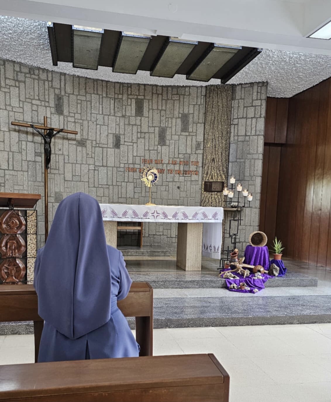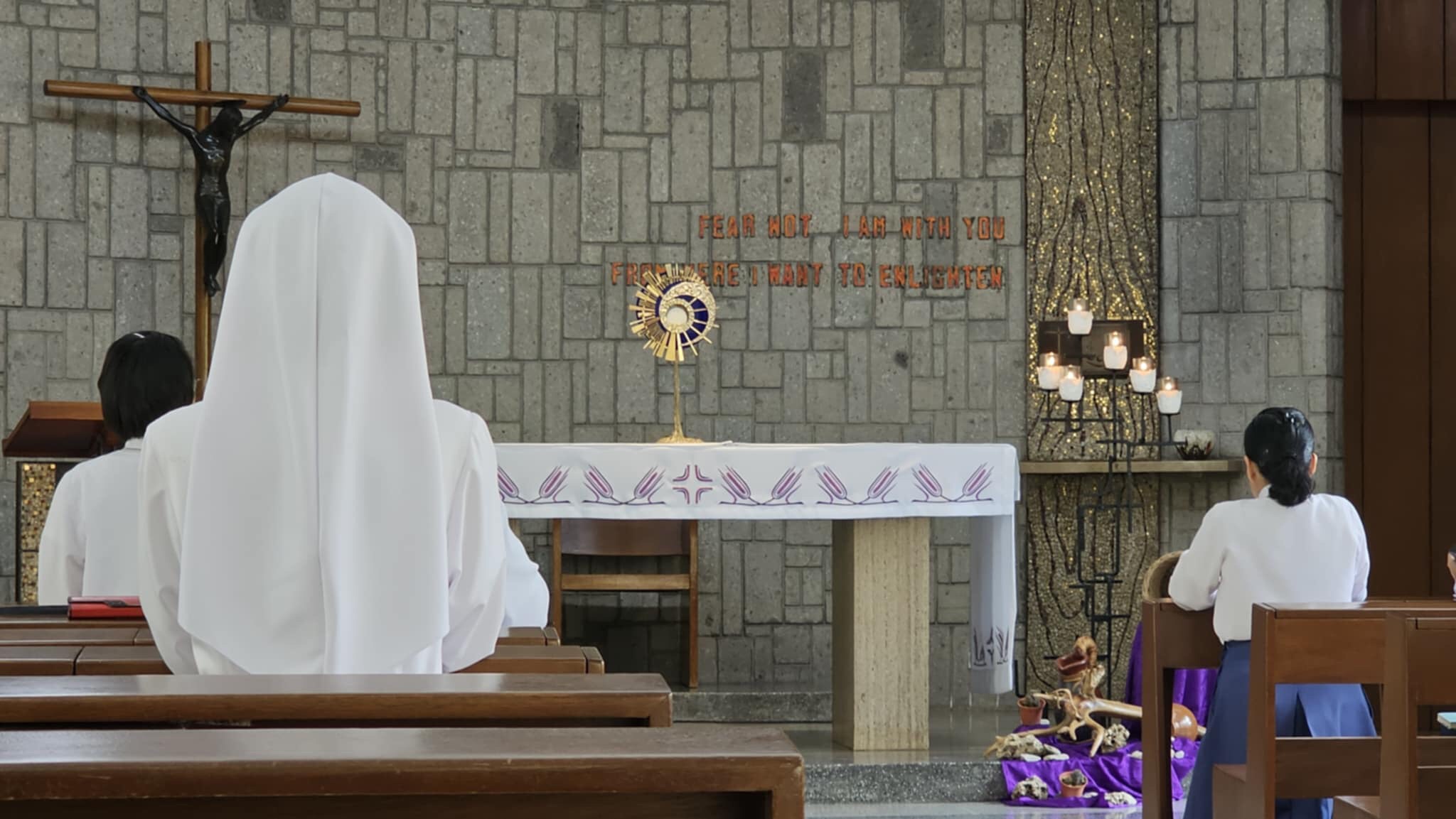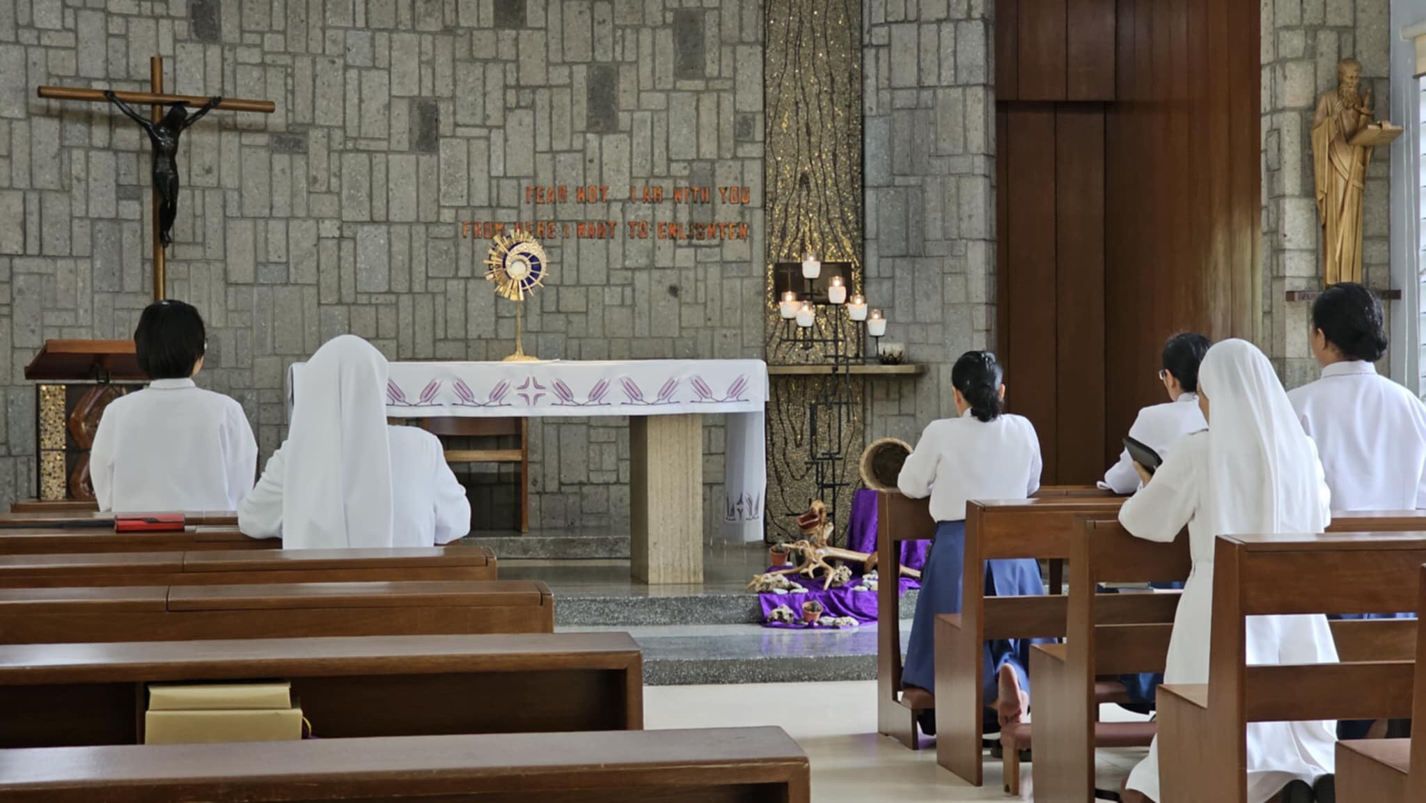 The words of Jesus resound in us: “Come to me all of you.” In the Eucharist we renew the pact which binds us to trust in God and direct all of our energies toward the coming of his Kingdom on earth. We allow ourselves to be led by the Spirit in our search for the face of God, as we follow the example of our brothers and sisters who preceded us in the vocation. We persevere in the trials of our spiritual journey and in our apostolate strengthened by the promise of Jesus Master in the Eucharist: “Do not be afraid. I am with you. From here I want to enlighten you. Be sorry for sins. (RL Art. 12)
